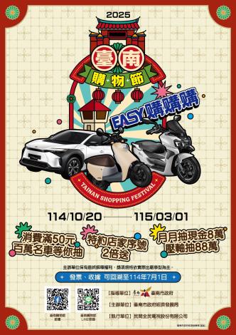 2025 年臺南購物節活動持續到明年 3 月 1 日,只要在臺南消費滿 50 元就可獲得抽獎序號,獎項包括百萬電動車、3C 實用家電、露營休閒設備、飯店住宿券等好禮,現金獎更是全面升級,月月抽 8 萬元,壓軸再抽現金88 萬元! 加入「2025 臺南購物節」官方 LINE 帳號,即可輕鬆進行登錄,購物首選就來臺南旅遊 GO 購,買越多越有機會把大獎帶回家。